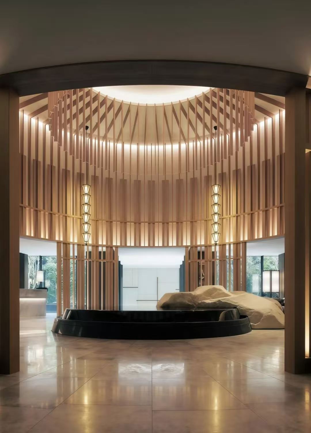 现代空间设计分析:以木质格栅与圆形舞台为核心的空间