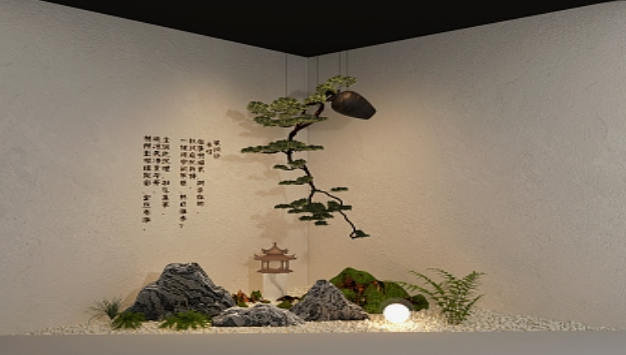 在室内空间的幽僻角落,一场与东方美学的邂逅悄然上演。这个精心雕琢的景观,宛如一首无声的诗,一幅立体的画,将自然的灵秀与人文的雅致完美融合。
