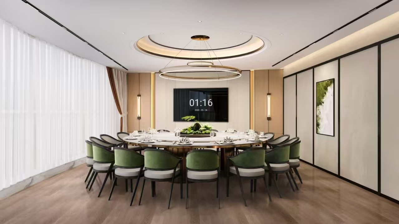 此包间设计巧妙融合现代与中式元素,营造出别具一格的用餐环境,在空间布局、色彩搭配、家具选择以及装饰细节上均有独到之处。
